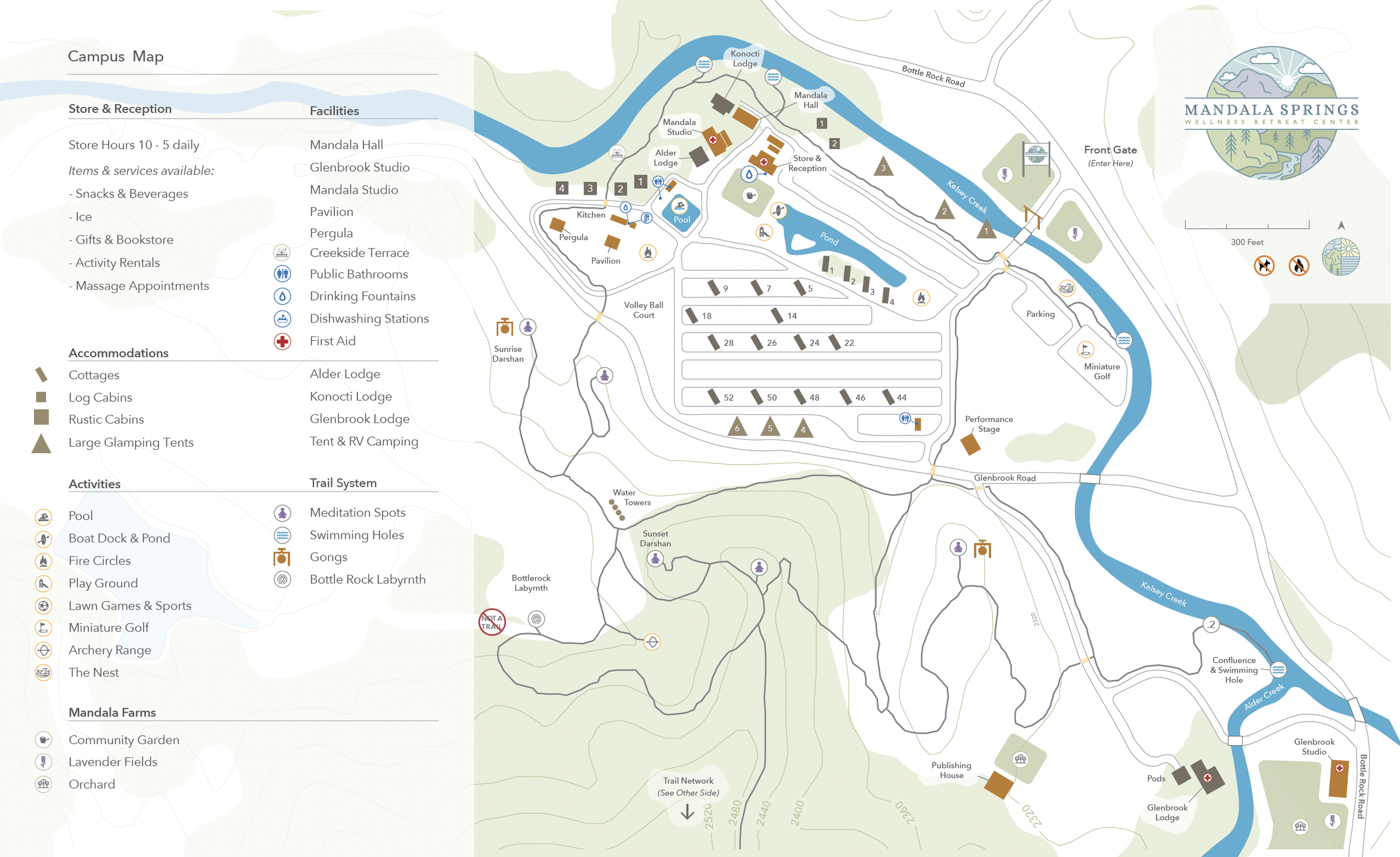 We have a variety of unique meeting spaces for both large and small groups to gather. From an outdoor stage that is perfect for hosting +2,500 person festivals to the Mandala Store, which has all of the essentials that overnight guests may have forgotten — we have the facilities to meet your needs. Host a business workshop in Mandala Hall (1,250 sf) or Mandala Studio (1,190 sf) which is equipped with A/V capabilities or enjoy meeting at either on our outdoor yoga platforms that overlook Kelsey Creek or in our newly developed Glenbrook Studio (2,100 sf).